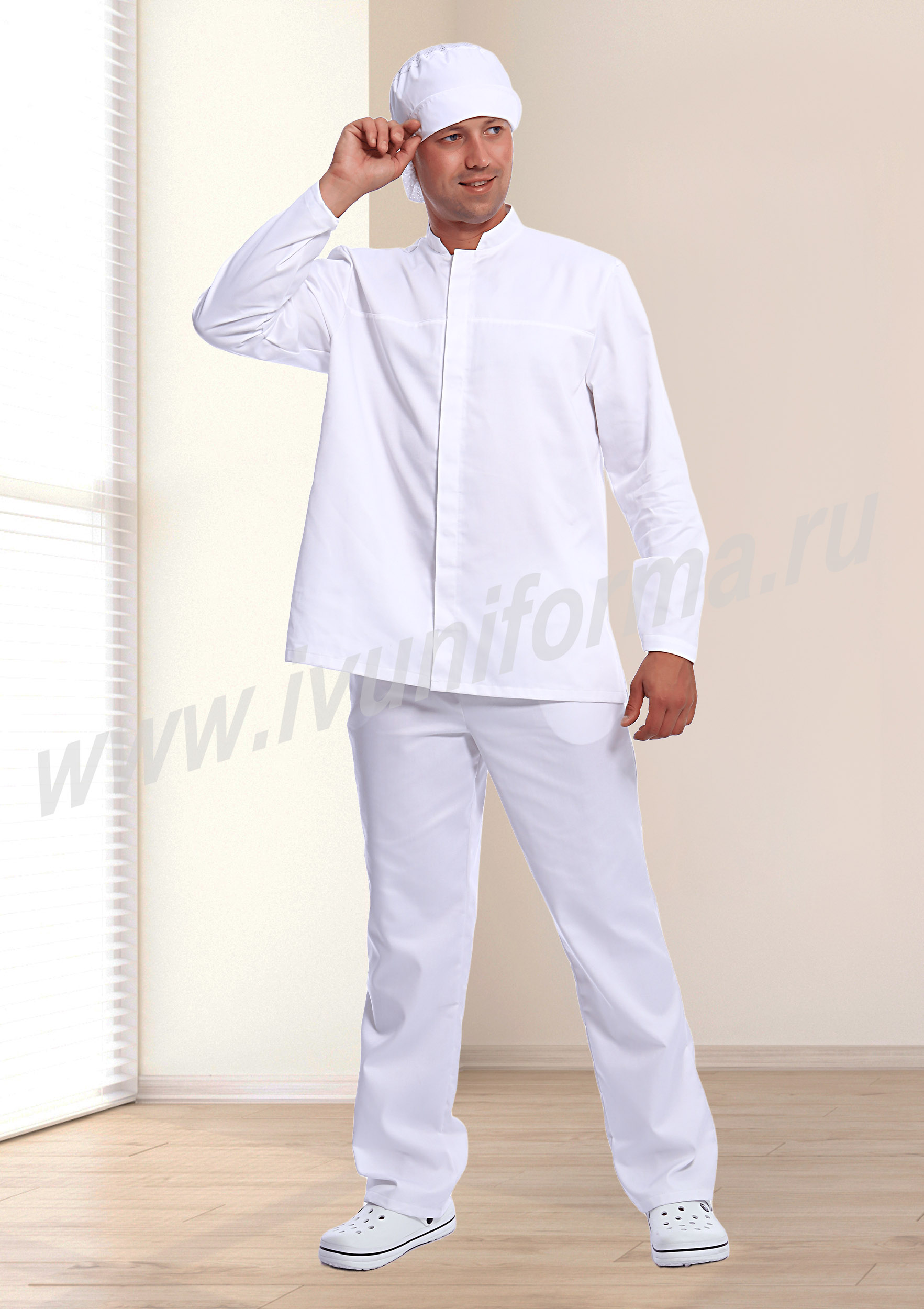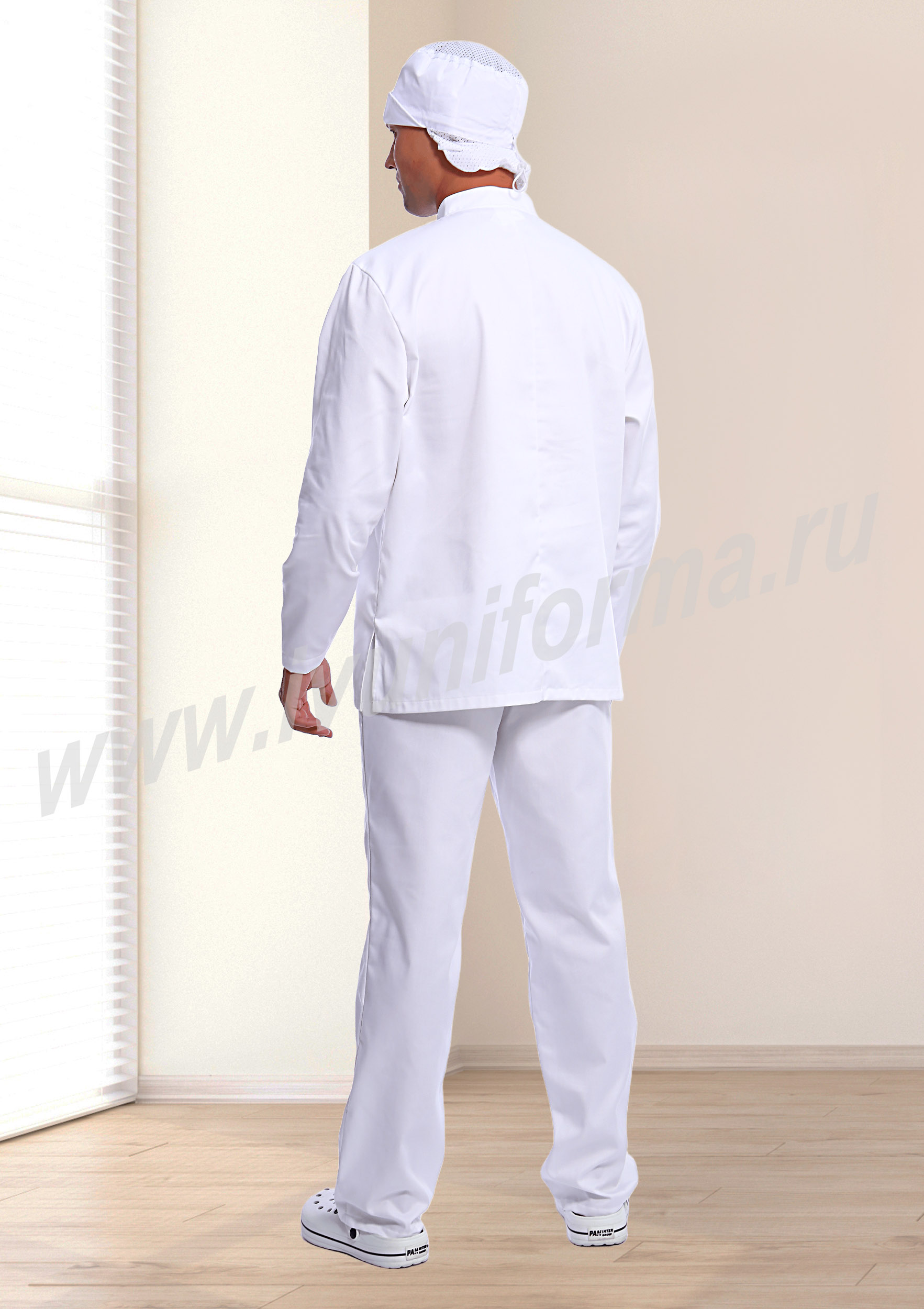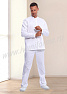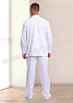Костюм мужской состоит из куртки и брюк. Куртка удлиненная прямого силуэта с центральной потайной супатной застежкой на кнопки. Полочки с отрезными кокетками, спинка со средним швом. Рукав втачной длинный, прилегание рукава по низу регулируется кнопками. Воротник-стойка обеспечивает изоляцию кожных покровов в области шеи. В боковых швах куртки предусмотрены разрезы для легкого доступа в карманы брюк. Брюки прямые на эластичном поясе с верхними боковыми карманами с наклонным входом. Костюм предназначен для защиты от общих производственных загрязнений. Модель разработана в соответствии с международными требованиями безопасности пищевого производства согласно системе НАССР (ХАССП).